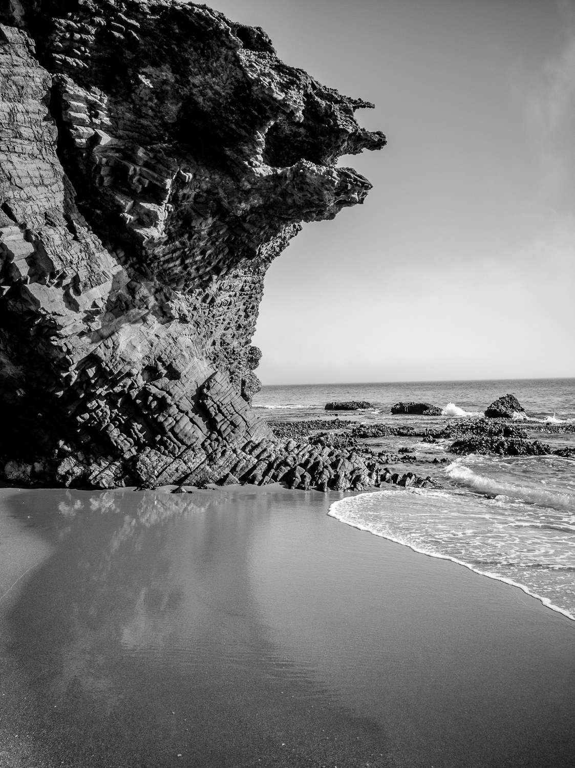 Esta fotografía la hice cerca de la Cala Carbón, a medio día mientras buscaba localizaciones. Como estaba nublado aproveché e hice la foto. Cuando volví por la noche la marea había bajado y ya no se veía igual el efecto del agua. También probé a hacerla con un gran angular, pero entonces entraba en el encuadre unas arenas muy feas.