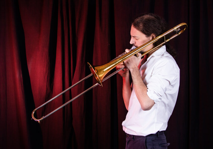 Reportaje fotográfico (retrato) a Jose «el del JazzBass». Jose tiene un programa sobre jazz en Radio Topo (Zaragoza, 101.8fm), toca el trombón y trajina con vinilos.